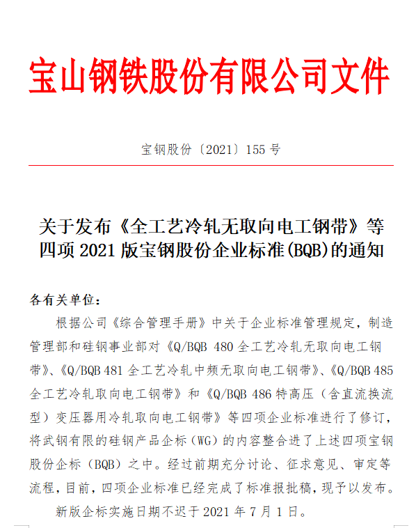 2021年4月28日,由股份制造管理部和硅鋼事業(yè)部牽頭修訂的四項(xiàng)硅鋼系列企業(yè)標(biāo)準(zhǔn)正式發(fā)布,并將于7月1日起實(shí)施。