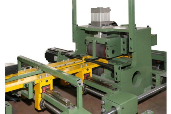 送料是本機的核心部分,它負責送料和測長,保證各種片型的長度精度,送料機主要核心部件有送料輥、測量輥、 導(dǎo)向定位導(dǎo)軌、伺服電機、編碼器、壓輥氣缸等組成。開卷機卷料料頭放出后,由送料機將卷料料頭送至沖剪床固定導(dǎo)軌。